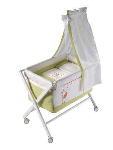 - Descriptif produit: Complet mini-cot in pistachio colour. cotton fabric. with mosquito net and its correspondent wood structure. wood structure in white with straight design and 4 weels, two of them with breaks. mattress in white pu,with easy breathing on top. quilted fabric for dressing the outside of the cot and 4 zippers to fix the fabric to the wood structure. duved with removable filler and embroidery technique design of jiraffe and tree, back side open to remove the filler. rectangular pillow with the two borders in pistacho colour. sizes: wood structure: 76x51x70 cm. textil: 55x85 cm. duvet: 50x67 cm. pillow: 50x26 cm. matress: 49x4x75 cm. bed base: 49x0,5x75 cm. fabric composition: 100% cotton. washing instructions: to wash on the reverse. washing machine 40c. do not use bleach. tumble dryer in low temperature. ironing 150c as maximum temperature. do not wash in dry