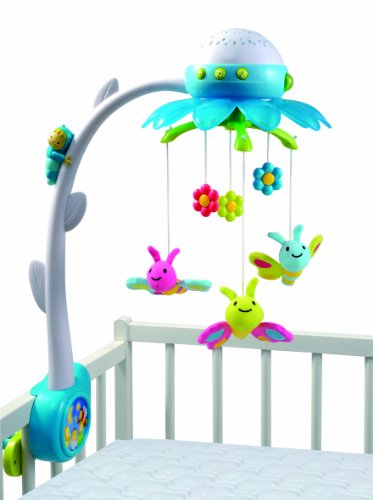 - Description du produit: Un joli mobile fleur pour accompagner doucement bébé dans ses rêves. 4 sons au choix pour apaiser bébé et favoriser l'endormissement (3 berceuses et 1 ambiance nature) Les 3 papillons en peluches émerveilleront bébé en volant au dessus de lui. Fleurs et papillons sont projetés au plafond avec une douce lumière changeant de couleur. Ingénieux : la télécommande permet aux parents de déclencher ou d'arrêter le mobile à distance Système de fixation astucieux, idéal aussi bien pour les lits à barreaux que pour les lits pleins.