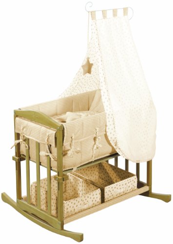 - lit de salon transformable en lit d'appoint, en berceau de bébé et en banc, hauteur réglable en continu, bois stratifié, accessoires: suspension en tissu, 2 caisses en tissu, linge de lit, garniture pour bébé, tige de baldaquin, matelas polyester non tissé: 80 x 43 cm, antiallergique, lavable, 4 roulettes avec un frein, 2 patins (bois massif), laver cet article à l'envers, température de lavage de 40°C, utiliser une poudre pour tissu délicat, ne pas surcharger le tambour, laver séparément le linge de lit la première fois, peut être mis au sèche-linge.